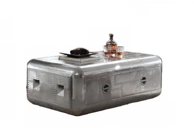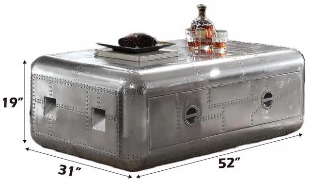 Storage: Coffee w/1 Drawer, End w/2 Drawers, Patchwork Aluminum Frame with exposed screws, Trunk Design w/Rounded Corners