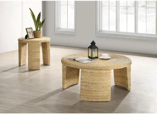 Round coffee table showcases a distinctive coastal-inspired natural design that brings a refreshing beach vibe to any room