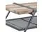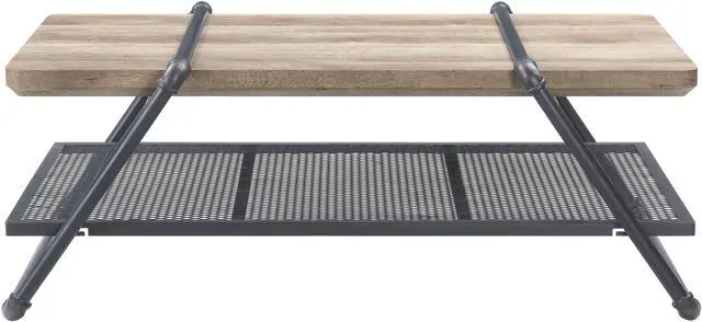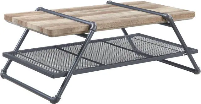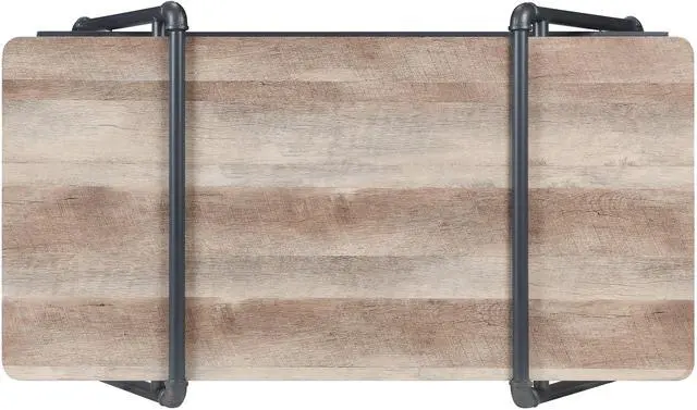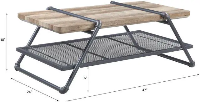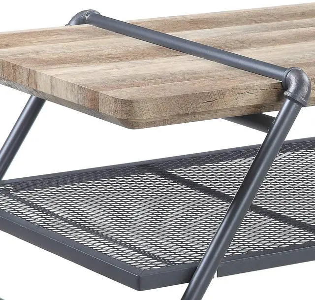This coffee table, finished in Oak and Sandy Gray, combines rustic charm with industrial flair for a stylish centerpiece in any living room.