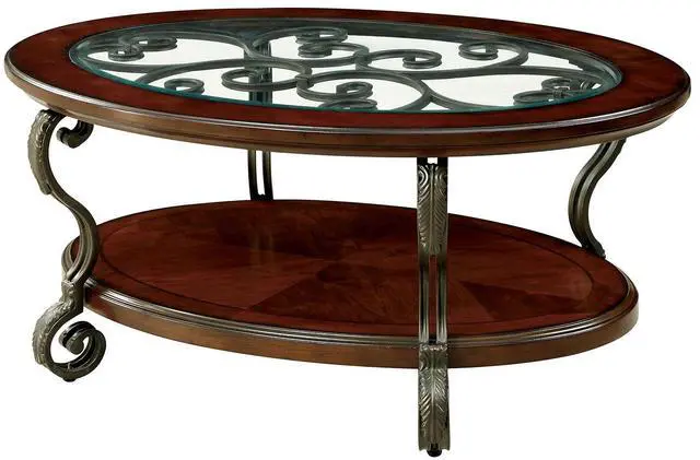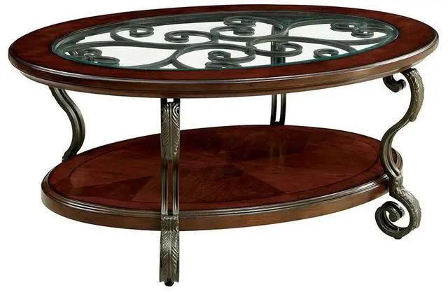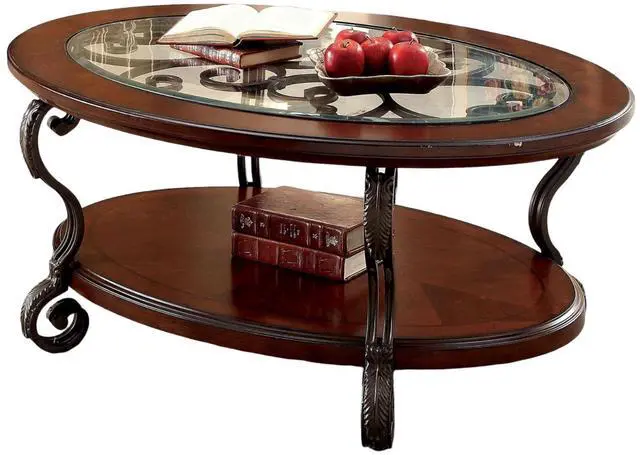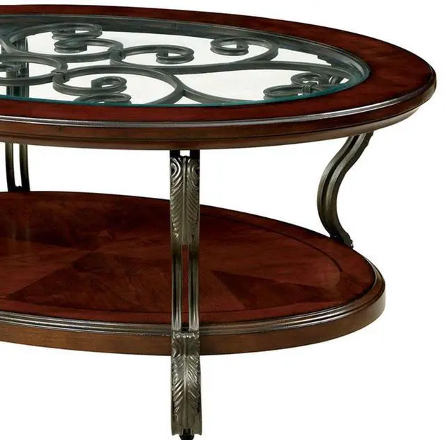 Traditional Style Brown Cherry Metal, Wood Open Bottom Shelf Ornate Design Scroll Detail Legs Glass Insert Top Listing includes - 1pc Coffee Table Only.