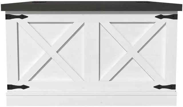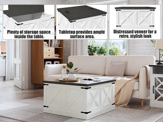 Two-tone farmhouse coffee table with dual-lift tops, plank-effect styling, heavy distressing & industrial hardware.