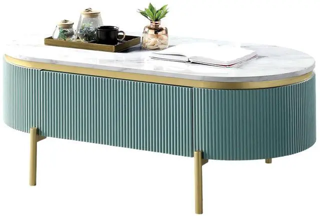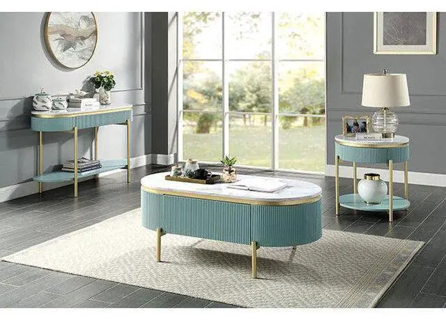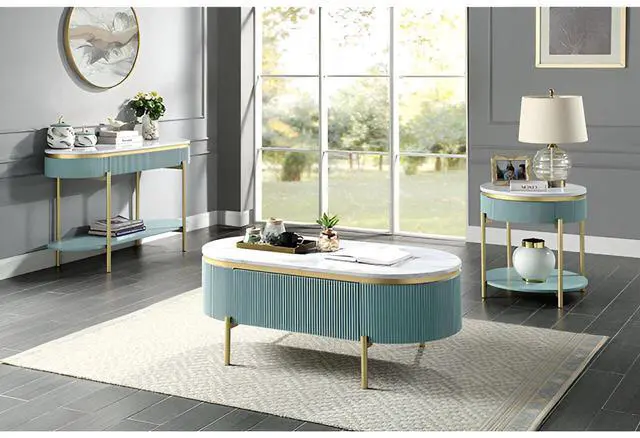 Glam Contemporary Light Teal 1pc Coffee Table White Faux Marble Top Living Room Table W Drawer