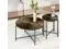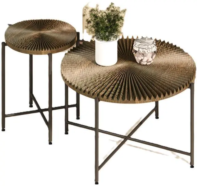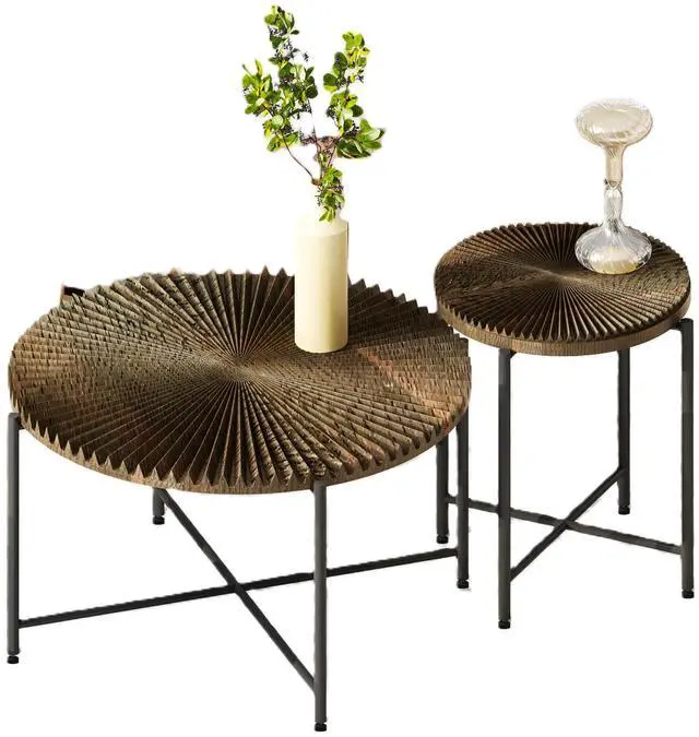 Radial Pattern 2-Piece Coffee and End Table Set Waterproof MDF with PVC Cover, Distressed Cylindrical Design, Black Metal Legs Classic Rustic Charm, Dark Walnut