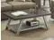 Features overextended rectangular top and a splayed-leg look. A shelf underneath the table top provides extra storage space