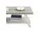 Features overextended rectangular top and a splayed-leg look. A shelf underneath the table top provides extra storage space
