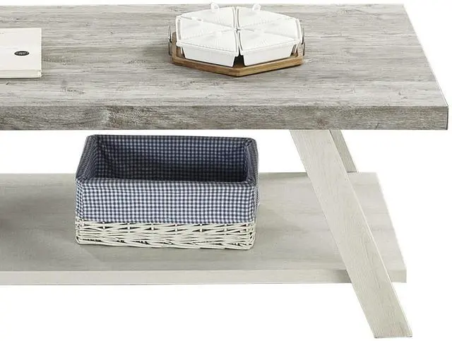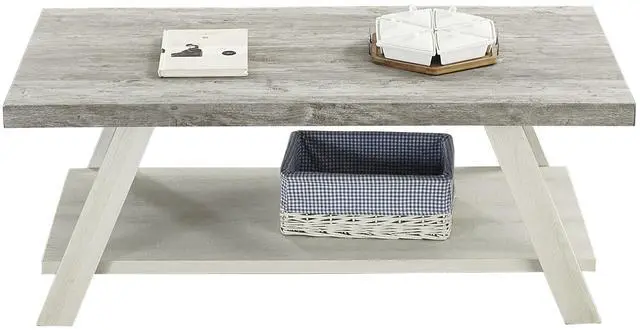 Coffee table with a weathered gray finish on table top and beige finish on the base