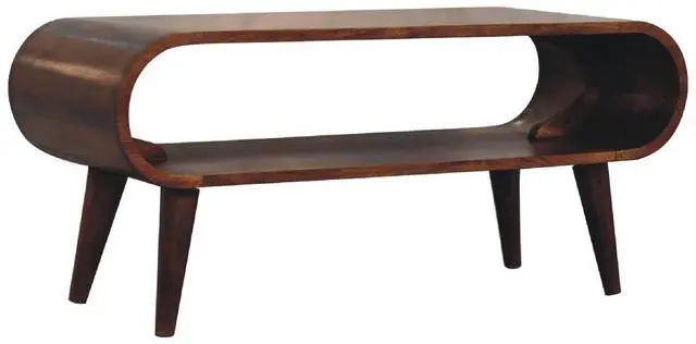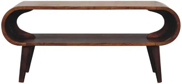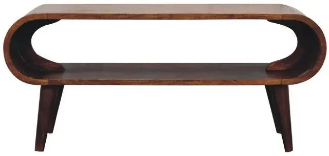 Explore our Amaya range featuring this simple open media unit which is constructed from 100% solid mango wood in a chestnut finish and features nordic style legs and smooth round edges, which will give a modern feel to the home as well as be safe around small children and animals. Display this piece beautifully in your home and allow the natural grain pattern to really shine.