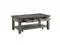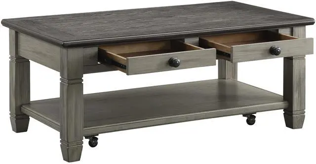 Made of oak and rubberwood veneer, wood and engineered wood 2-tone finish: coffee and antique gray 2 dovetail drawers with ball bearing glides Lower shelf Flat black tone knobs Casters for easy movement