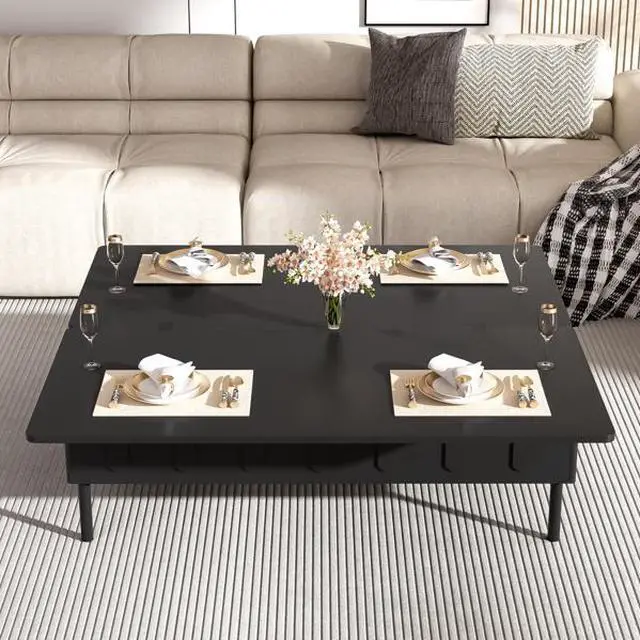 Can be transformed into three modes: Coffee Table: When the table is fully closed, it functions as a stylish coffee table that blends seamlessly into your living space. In this configuration, the table offers a spacious surface for placing drinks, remote controls, or decorative items. Functional Work Desk: When you need to work or relax on the couch, the tables lift-top feature comes into play. The surface can be easily raised to a more ergonomic height, making it suitable for use as a small desk or work table. The raised surface is designed to ensure that you can sit comfortably on the sofa without straining your back or neck. Foldable Dining Table: When its time to host a meal or dinner party, the table can be extended into a full dining table. The foldable tabletop allows the coffee table to open up, providing ample space to accommodate 4 to 8 people. This makes the table perfect for family dinners, hosting friends, or even a casual meal with guests.