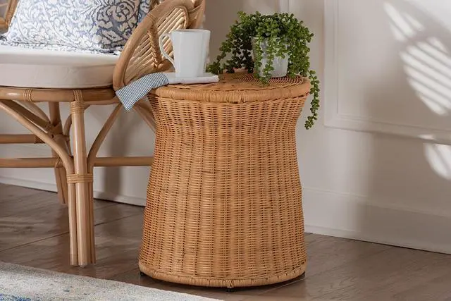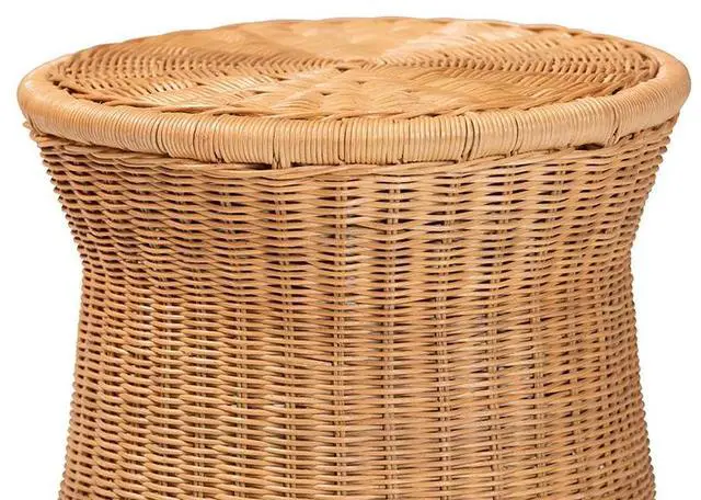 Temper the cozy warmth of your space with the natural tones and rustic style of the Caroline end table. Made in Indonesia, this bohemian piece is handcrafted from sustainably sourced natural rattan. Its intricately woven exterior creates a rich texture with visual flair while its round silhouette effortlessly complements a variety of layouts. The Caroline will arrive fully assembled and is fitted with rubber non-marking feet for superb stability in any setting. Crafted with passion, the Caroline end table is a vibrant addition.