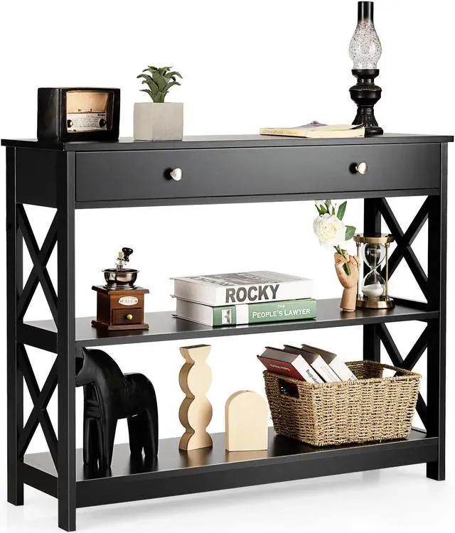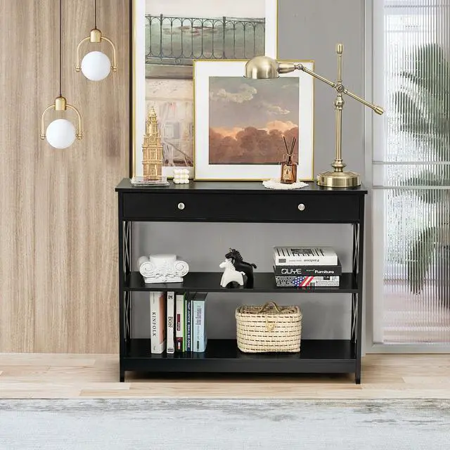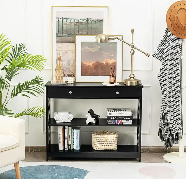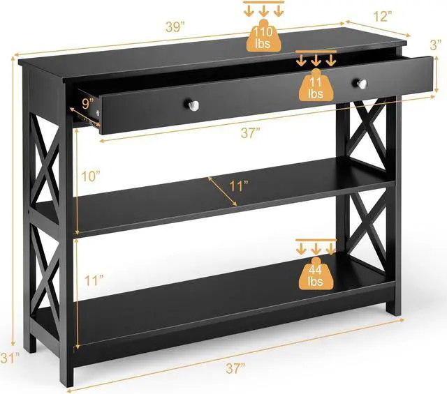 Sturdy Construction: Made of solid MDF with odorless painting finish, this 3-tier console table stands the test of time and comes with strong loading capacity up to 209 lbs. And the X-shape structure on both sides provides extra strong stability to prevent wobble.