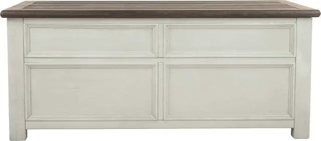 FARMHOUSE COFFEE TABLE: Quaint, but never boring, this table' s distressed finish puts the farm in farmhouse. The compact, lift-top design makes it handy for storage in a living room