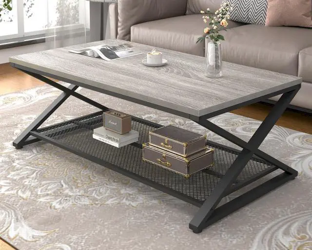 LVB Gray Coffee Table, Farmhouse Wood Metal Center Table with Storage for Living Room, Industrial Wooden 2 Tier Rectangle Cocktail Tea Table with Mesh Shelf for Office Bedroom, 47 inch, Light Grey Oak