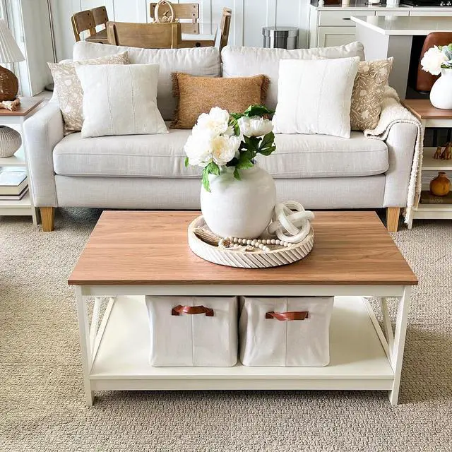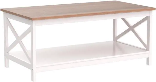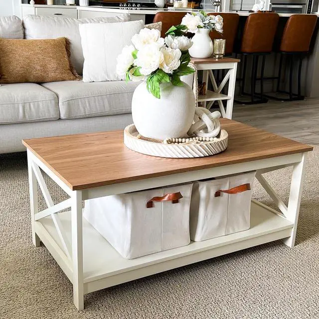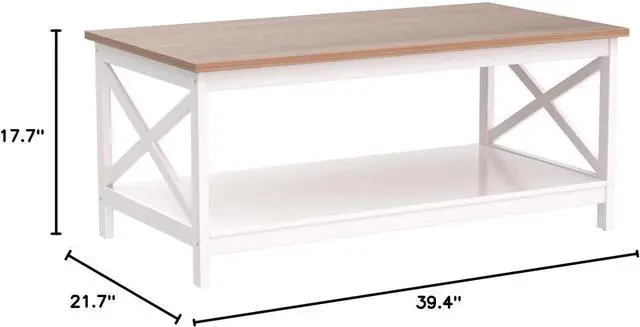 2 Tier Shelf & Farmhouse FeelThe coffee table size is 39.4 " D x 21.7 " W x 17.7 " H. Perfect for before the sofa or in your living room. The farmhouse color matches with any other furniture and gives a good look to the room