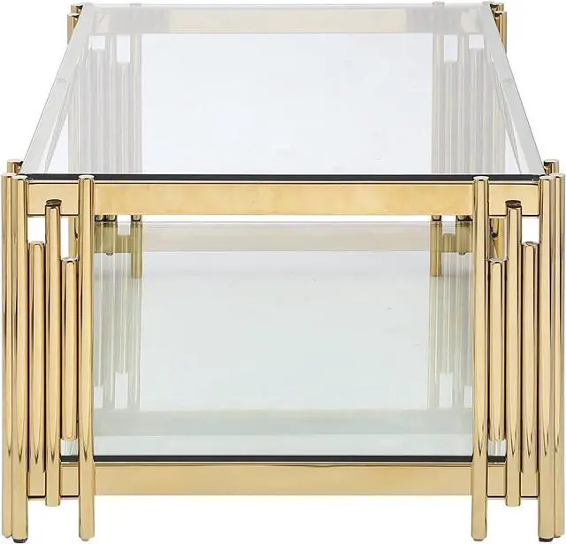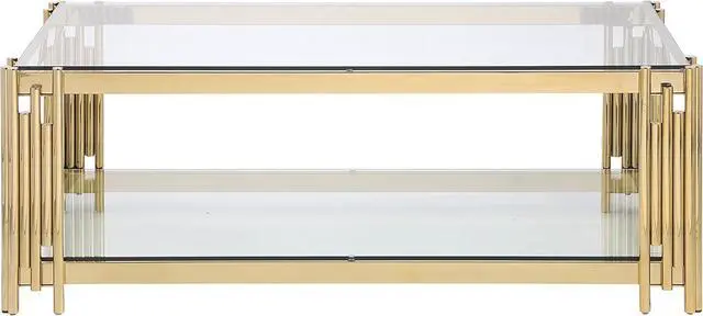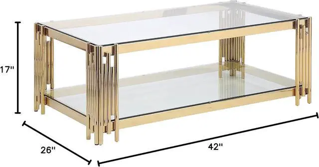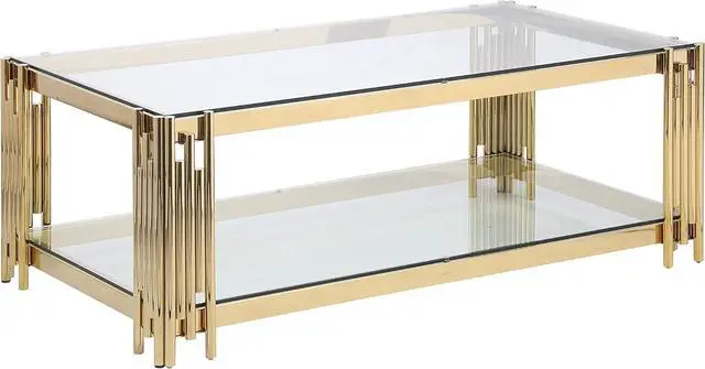 With two shiny tempered glass shelves and Irregular cylindrical stainless steel pipe welding, this gold coffee table is designed to stand out in your home.