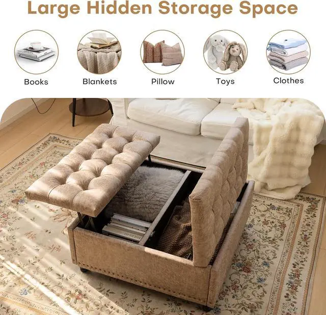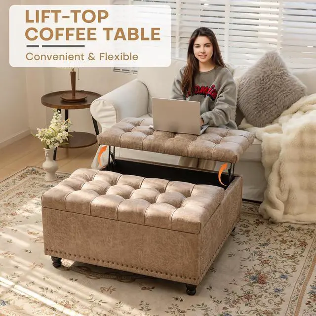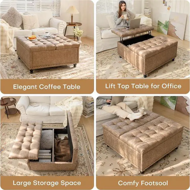 MULTIFUNCTIONAL USE: This living room ottoman can be used as a footrest, coffee table and storage cabinet. The innovative top lifting design can also meet your needs to work while sitting on the sofa. It is extremely practical
