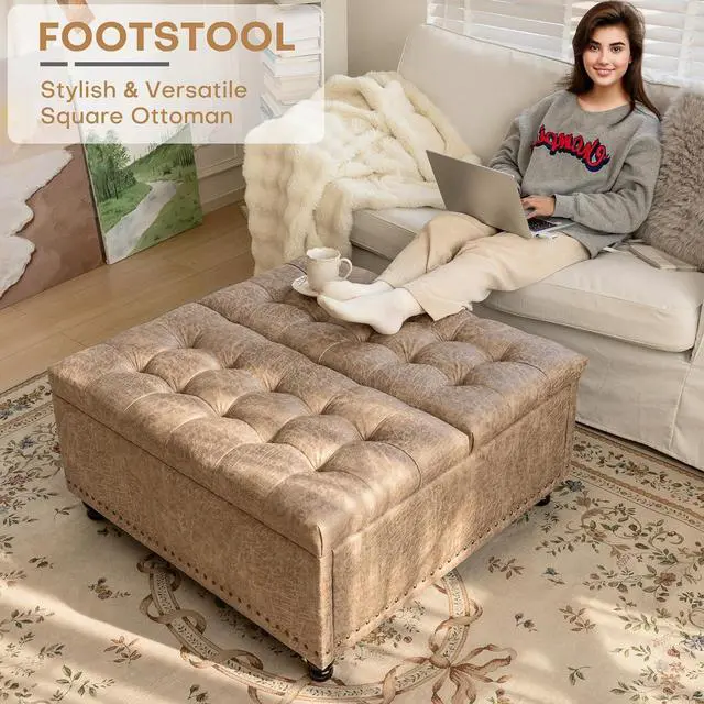 LARGE SQUARE STORAGE OTTOMAN: 47-gallon capacity for storing blankets, pillows, toys and magazines. The partitioned storage can classify items and keep the space neat and organized
