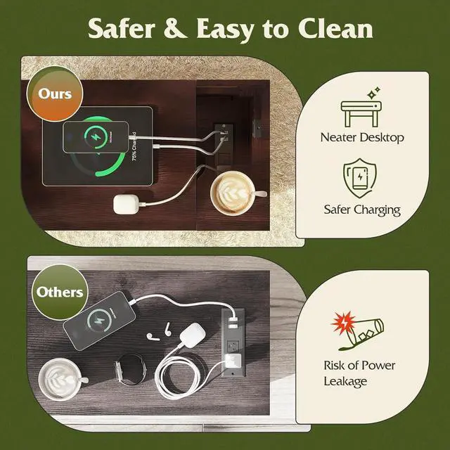 Safer & TidyUnique hidden flip-top cover and built-in plug, so that it' s no need to empty the desktop while using the plug. When charging the flip cover can be closed to prevent drinks from spilling on the table in direct contact with the plug, safer to use.
