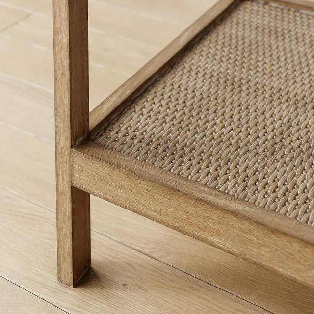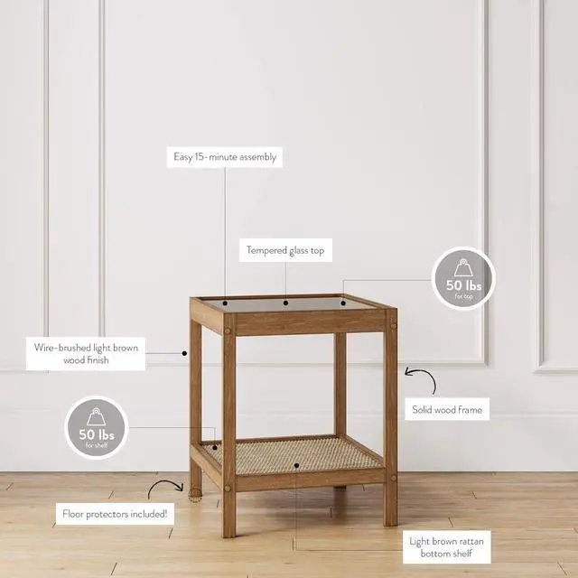 Hayes is a modern end table or accent table that has ample storage space with its tempered glass top, a lower open rattan shelf, and a solid wood frame in light brown finish.