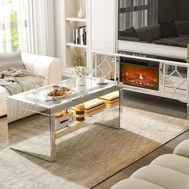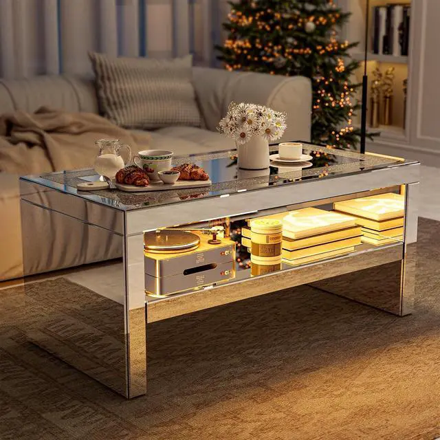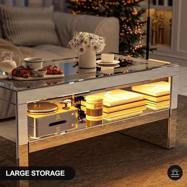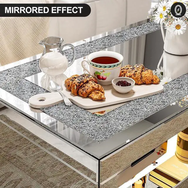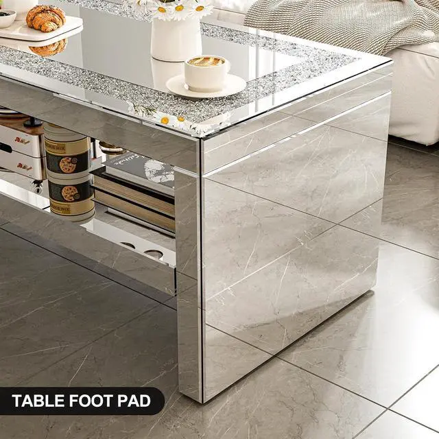Sparkling Crystal DesignThis coffee table has a mirror and Crystal design and add beauty and style to most any decor. The contemporary look is simple in shape and elegant appearance, which can seamlessly compatible with your room decor.