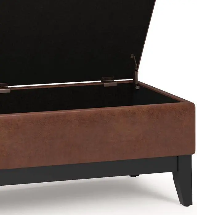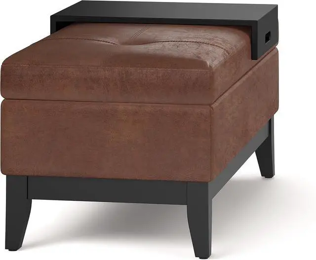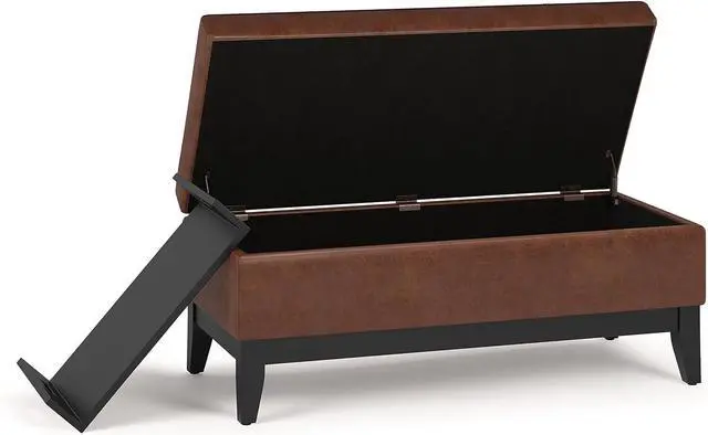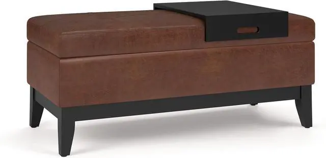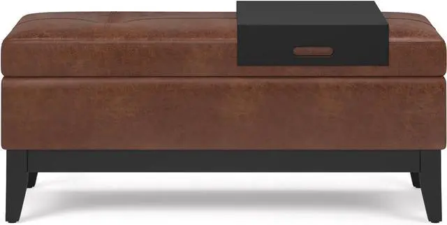 SIMPLIHOME Oregon 42 inch Wide Transitional Rectangle Lift Top Storage Ottoman Bench Removable Tray, Upholstered Distressed Saddle Brown Tufted Faux Leather, Coffee Table for Living Room