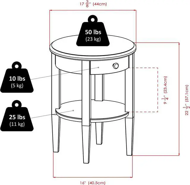Round End Table sits on sturdy legs and feature a small drawer plus shelf. This table will add warmth and charm your living room. Solid Beachwood in Antique Walnut Finish Assembly Required