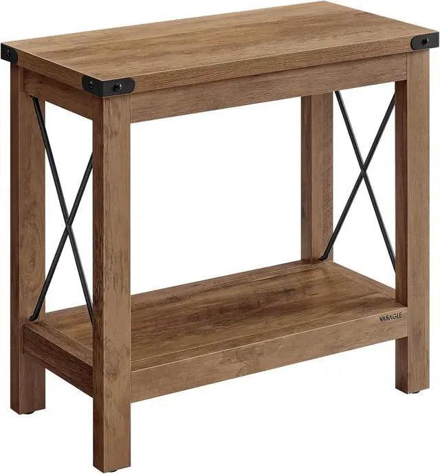 FARMHOUSE CHARMThis end table features honey brown panels, complemented by metal X-bars and corner accents, adding a cozy and inviting farmhouse vibe to your living space