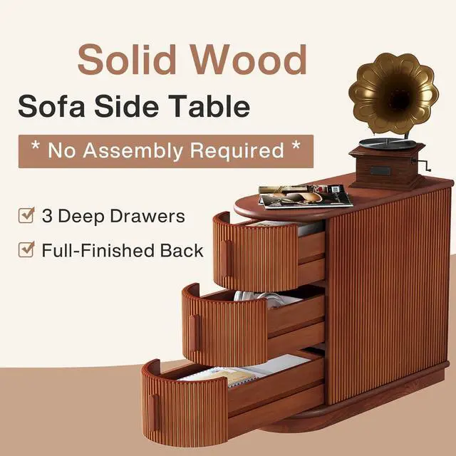 Distinctive Aesthetics - This 3-drawer solid end table presents an eye-catching design with its sleek, waterproof tabletop enhanced with curved edges. The front and side views show off distinctive vertical lines that pair beautifully with the curved tabletop, setting it apart from ordinary side tables. With a walnut finish, it artistically combines modern functionality with a rustic naturalistic feel, seamlessly blending with any home interior while setting a stylish ambiance