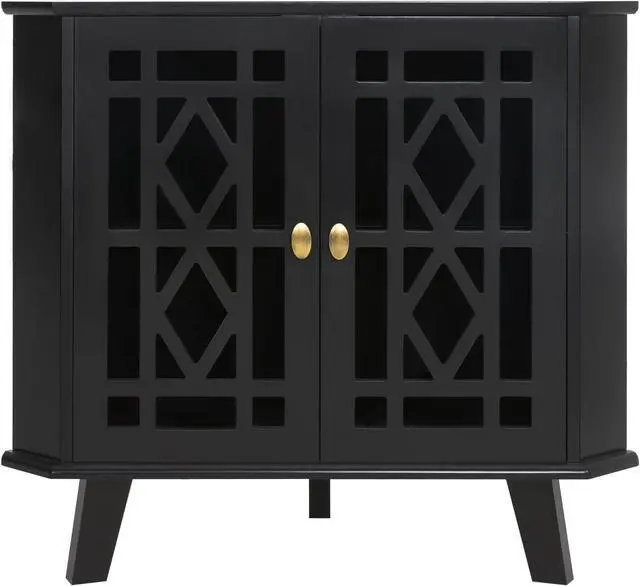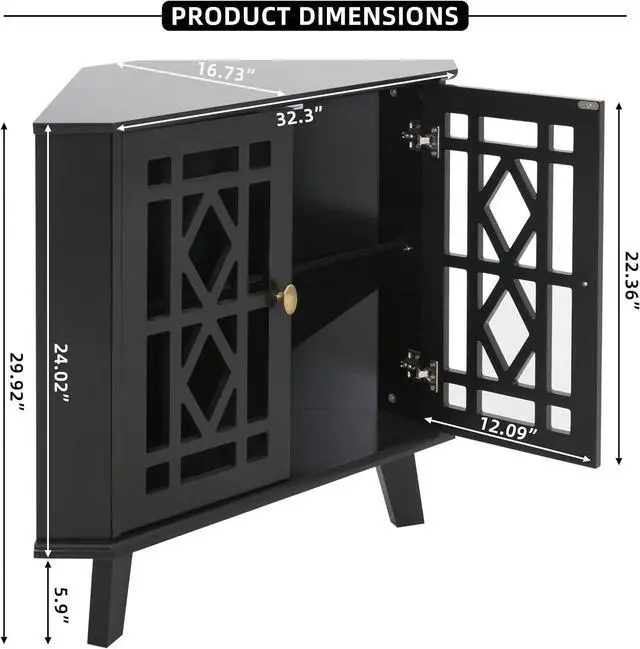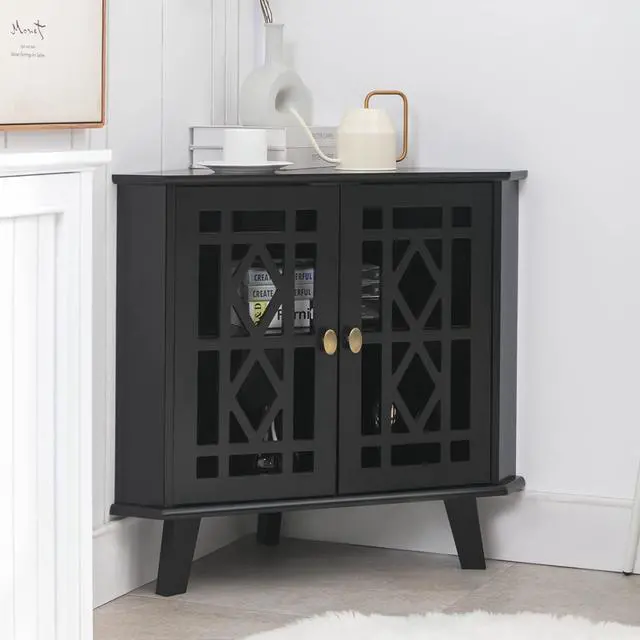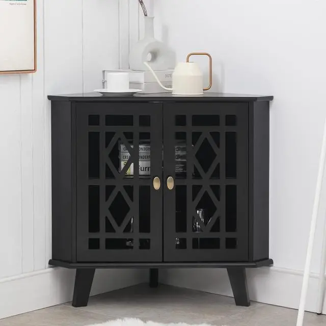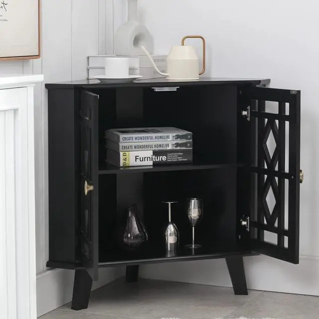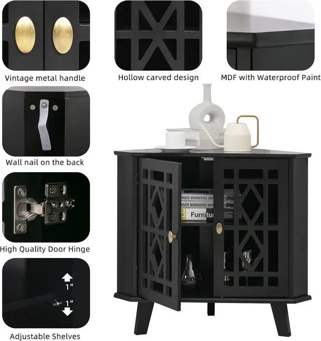 Retro&Unique Design The 2 doors of our corner cabinets are designed with hollow engraving. Its retro design has an ingenious impact on your modern style family, making your home more layered. From the view of the top, the entire cabinet presents a right triangle, which makes it more suitable for the corner of your home. It can not only store your daily necessities, but also be used as a decorative furniture.