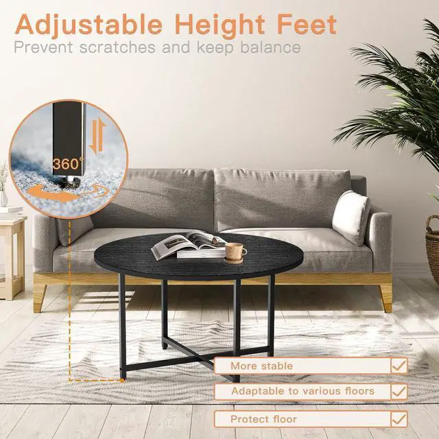 Adjustable Height Feet The wood coffee tables is equipped with four extra silent adjustable feet and this can add extra stability and easy movement without damaging the floor. Also if the ground is uneven, the adjustable feet can also suits the height of small round coffee table to achieve a stable state