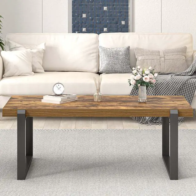 Modern Wood Coffee Table: Featuring a rustic brown wood grain finish and an industrial black metal frame, wooden coffee tables for living room combines minimalist design with industrial vintage style, perfectly complementing your home decor.