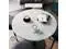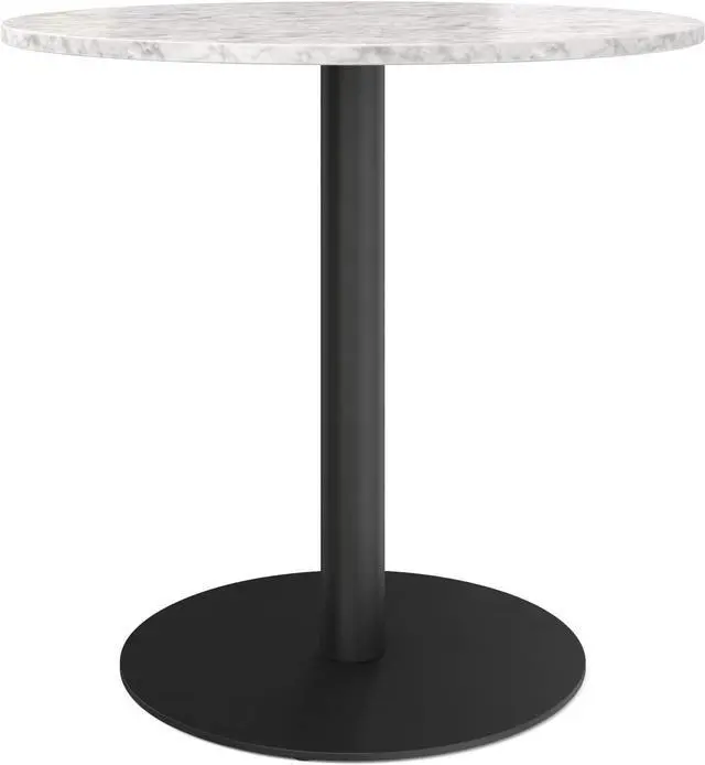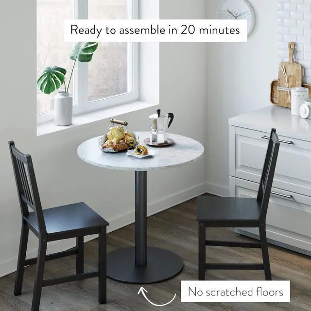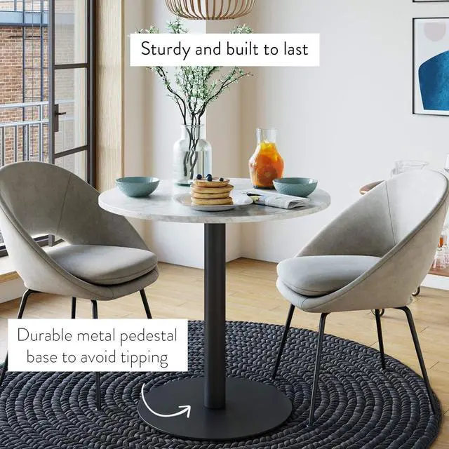 An elegant kitchen table with pedestal base and marble tabletop finish to seat 2 to 3 people.