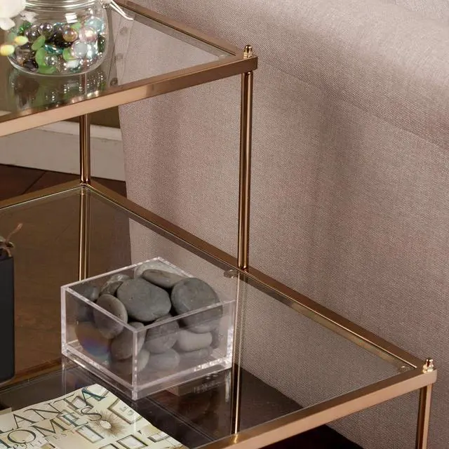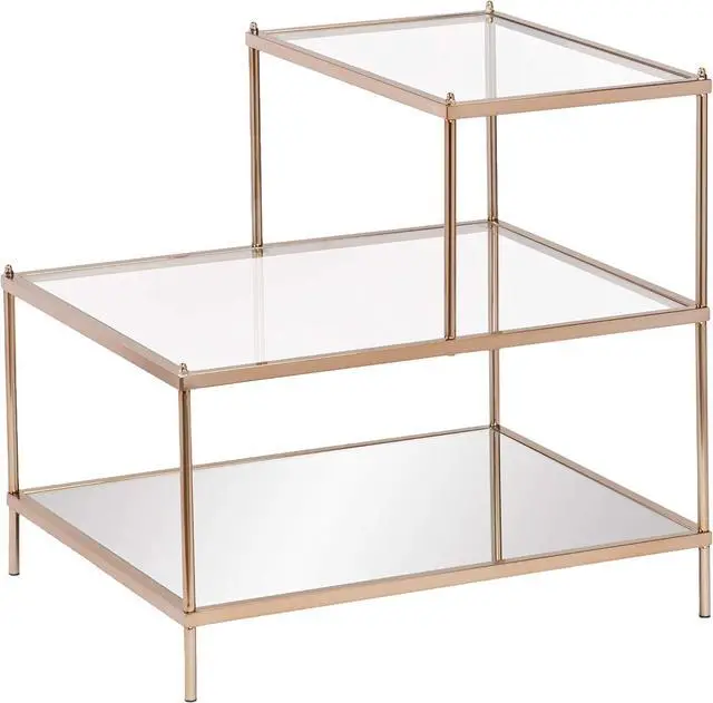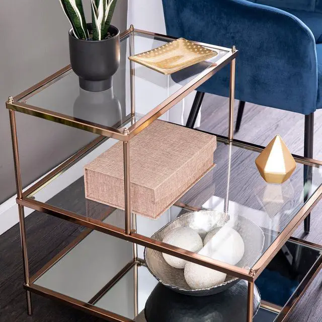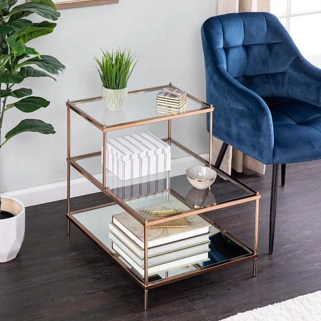 Space-saving end table is made with plated iron, 5 mm clear tempered glass, and 5 mm mirror