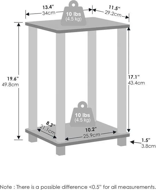 Both the top and lower shelves are designed to hold up to 10 lbs each.