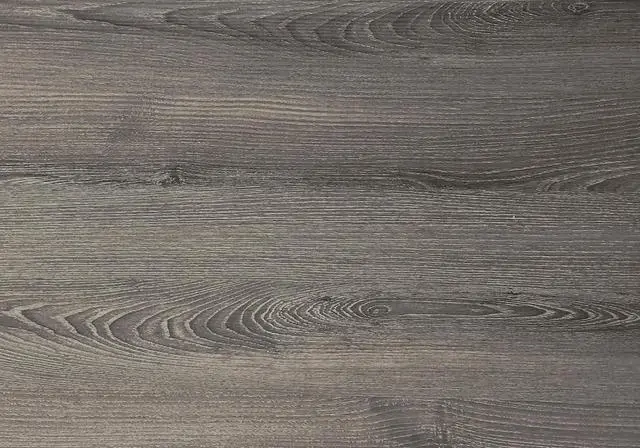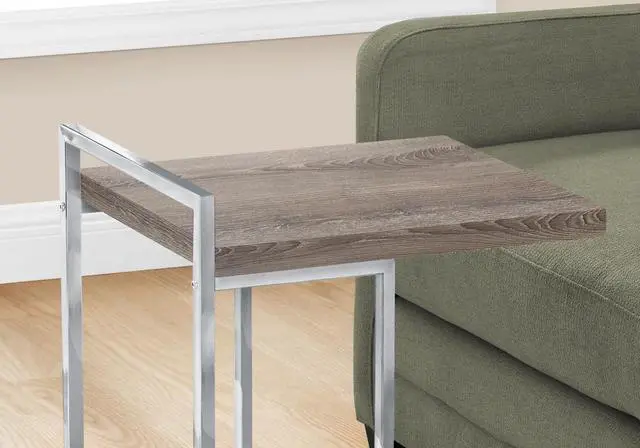 Thick, rectangular tabletop in a dark taupe wood-look finish is wide to offer a more generous surface