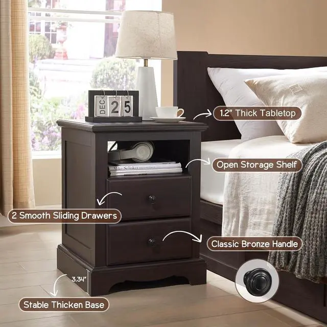 Spacious Storage - Keep your essentials organized and easily accessible with twosliding drawers and an open shelf. The smooth gliding wheels ensure that thedrawers open and close smoothly every time. The tabletop is also perfect for matching various styles of table lamps.