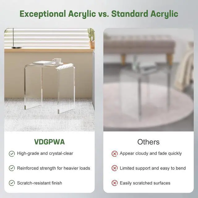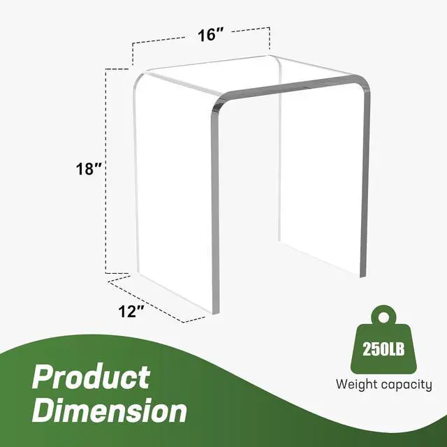 Solid Thicker Acrylic - Made of 15mm thicker molded acrylic with one-piece technology. 250 LBS weight capacity is sturdy enough to support anything such as laptops, plates, magazines, books or any exhibits and can be used as side table, nightstand, or vanity stool.