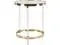 GOLD AND CLEAR LIVING ROOM TABLE: The round table boasts a polished gold finish with clear acrylic supports, and mirrored top, lending a refined aesthetic to its contemporary design