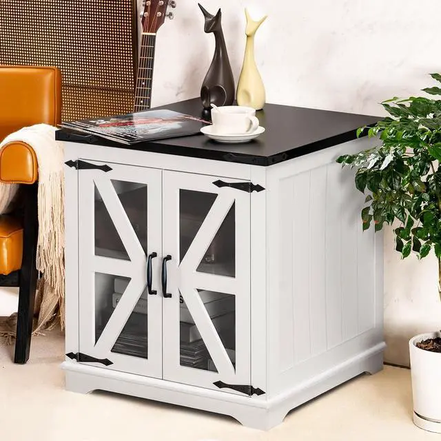[Chic Industrial & Farmhouse Design]: This end table uniquely blends farmhouse warmth with industrial ruggedness, featuring barn-style glass doors and matte metal accents. It adds vintage charm to any room and serves as a versatile storage solution, perfect beside any sofa, bed, or desk