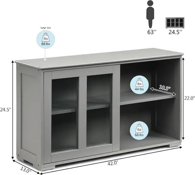 42' ' L x 13' ' W x 24.5 ' ' H for Multi UsesWith weight capacity up to 88 lbs on the top, this buffet sideboard is suitable for various rooms to meet your different needs. You can use it as a kitchen cupboard for serving ware, or a TV stand and sofa side cabinet in living room, or a bedroom organizer for placing bed linen and extra pillows, or an entry cabinet for organizing sundries.