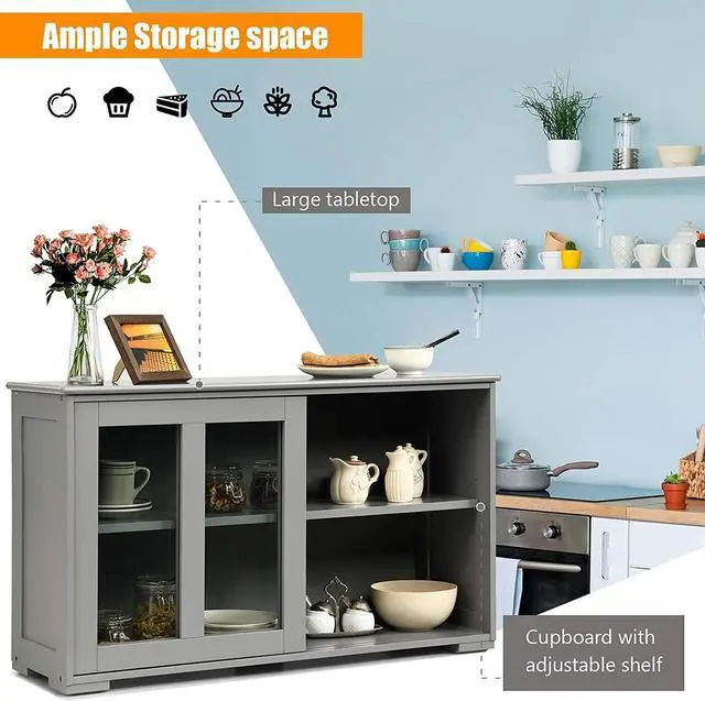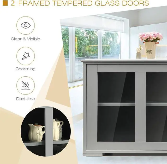 2 Glass Doors & 3-Position Adjustable ShelfThe kitchen credenza has 2 tempered glass doors, which not only helps to display decorative items, but also protects the stuffs from outside dust. And the 3-position height adjustable inner shelf allows you to reasonably customize the upper and lower space.