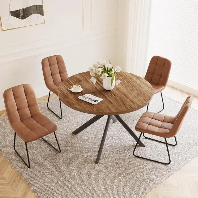 Functional Dining Set: This set includes a round table and 4 leather chairs, designed for easy conversation and gathering with family and friends.