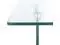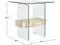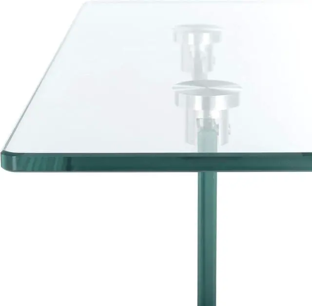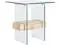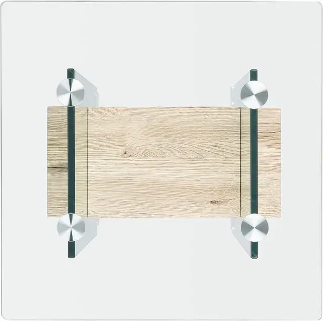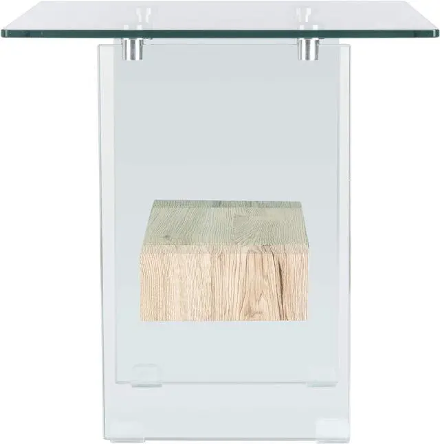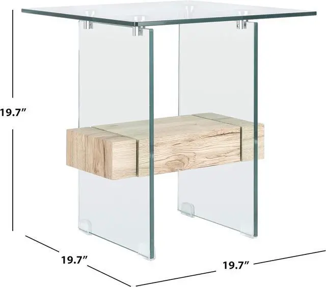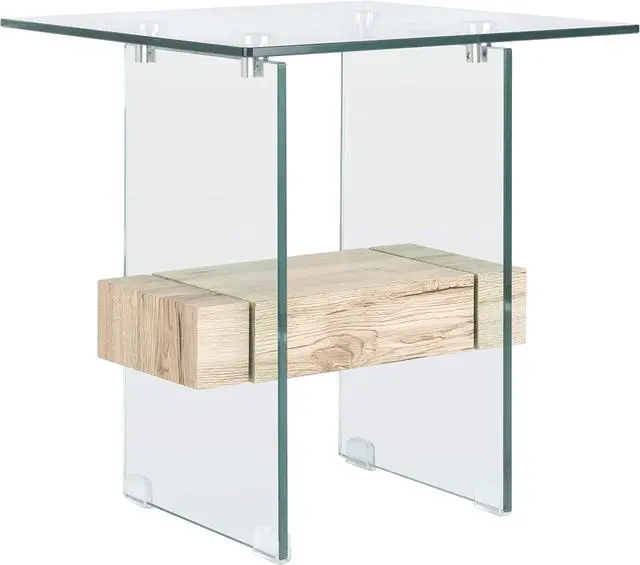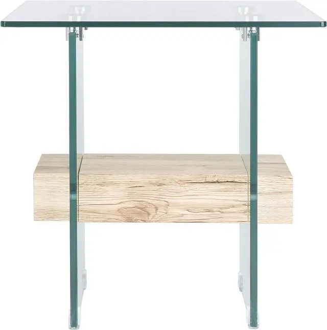 Features a clear glass design contrasted against a natural toned wood shelf
