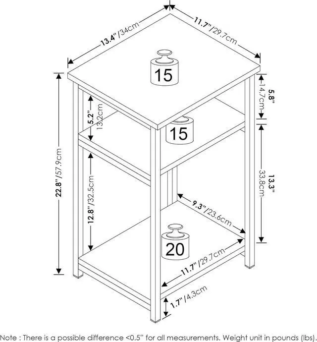 The 3-tier shelf offers additional storage that meets all of your different storage needs. The bottom can hold up to 20 lbs, and the top and middle shelves can hold up to 15 lbs.