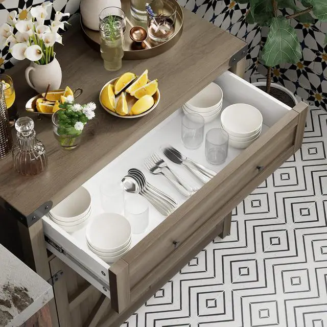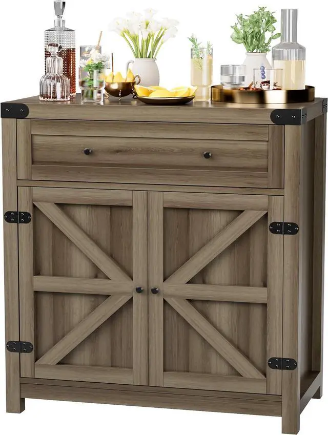 Storage Space]: The kitchen storage cabinet has a large drawer and two-door cabinet with an adjustable shelf to meet your storage needs for coffee beans, condiments and some miscellaneous items, while the wide tabletop can hold a microwave and coffee maker.
