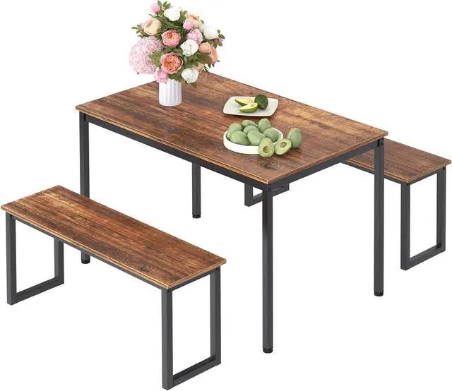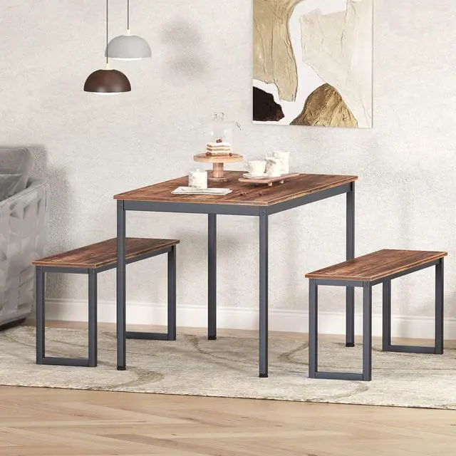 Nesting Design- Industrial brown tabletop and simple black metal frame look, Modern simple fashion dining table set is elegant and decent; Two benches can be nested under the table for storage. Two benched could accommodate 4 adult people or 6 children, ideal for kitchen, dining and living room small space.