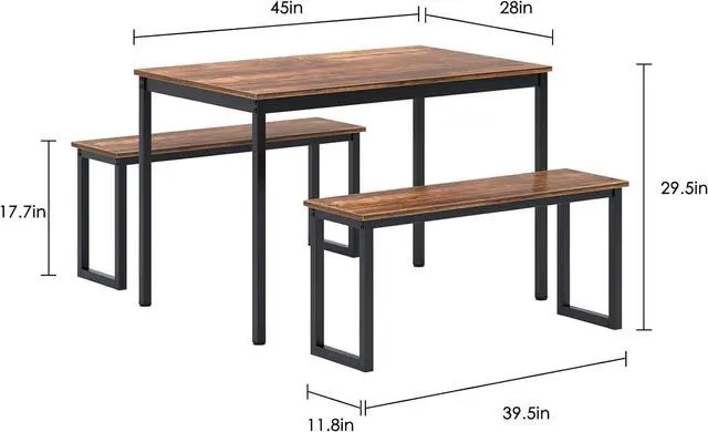 Dimensions of 3 Piece Dining Set- Dining Table dimensions: 44.9L x28W x 29.5H inches, Benches: 39.4 Lx 11.8W x 17.7H inches. Maximum load capacity 330 lbs (150kg) both for table and benches