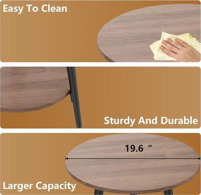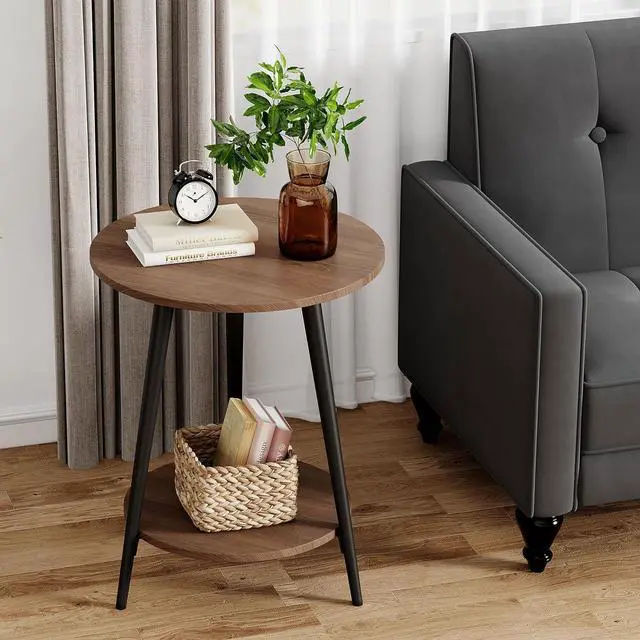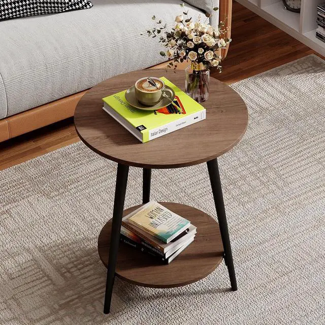 Sturdy and Stable Round Side Table Made of wood veneer with clear wood grain finish and thicker metal leg, Durable material, beautiful and classic. The whole bottom storage shelf acts legs to support all the table which can make sure its stable.