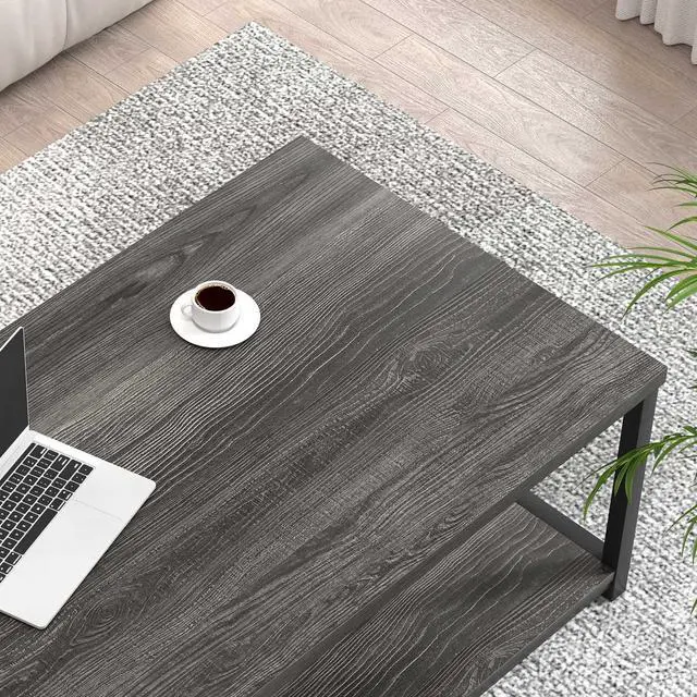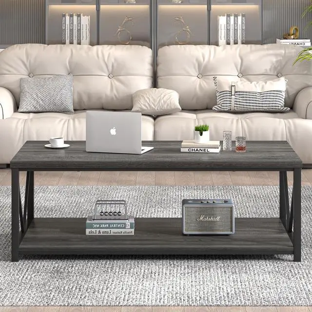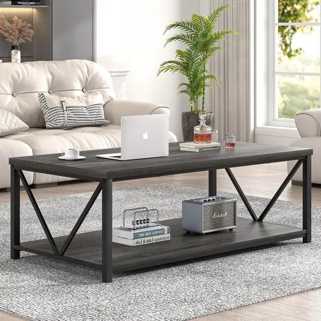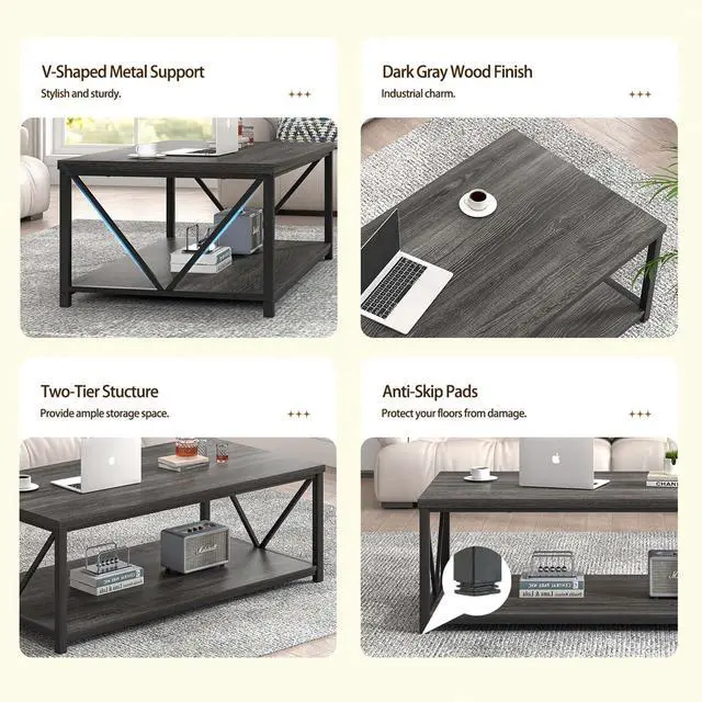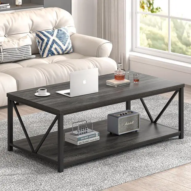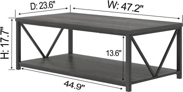 Modern Coffee Table: Featuring a dark gray wood grain finish and sleek black V-shaped metal side frames, this coffee tables for living room perfectly blend rustic charm with contemporary and industrial design elements, making it a nice centerpiece for any stylish space.