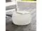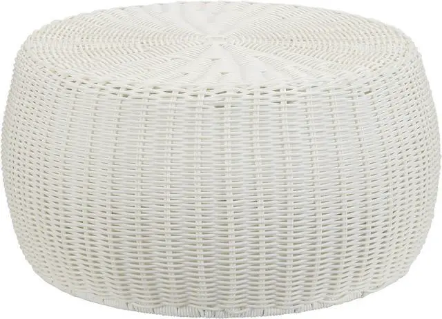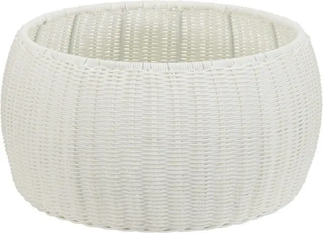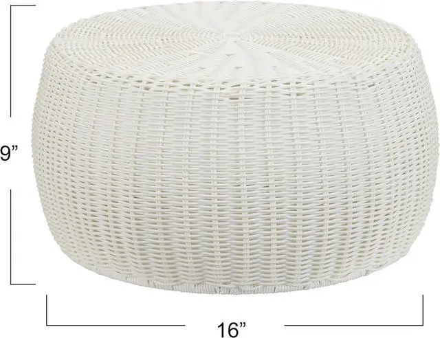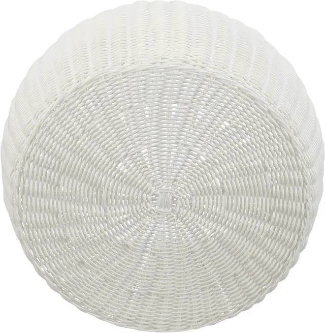 Features a solid white storage stool made of a beautiful resin weave that is handwoven around a metal frame for superior durability and support.